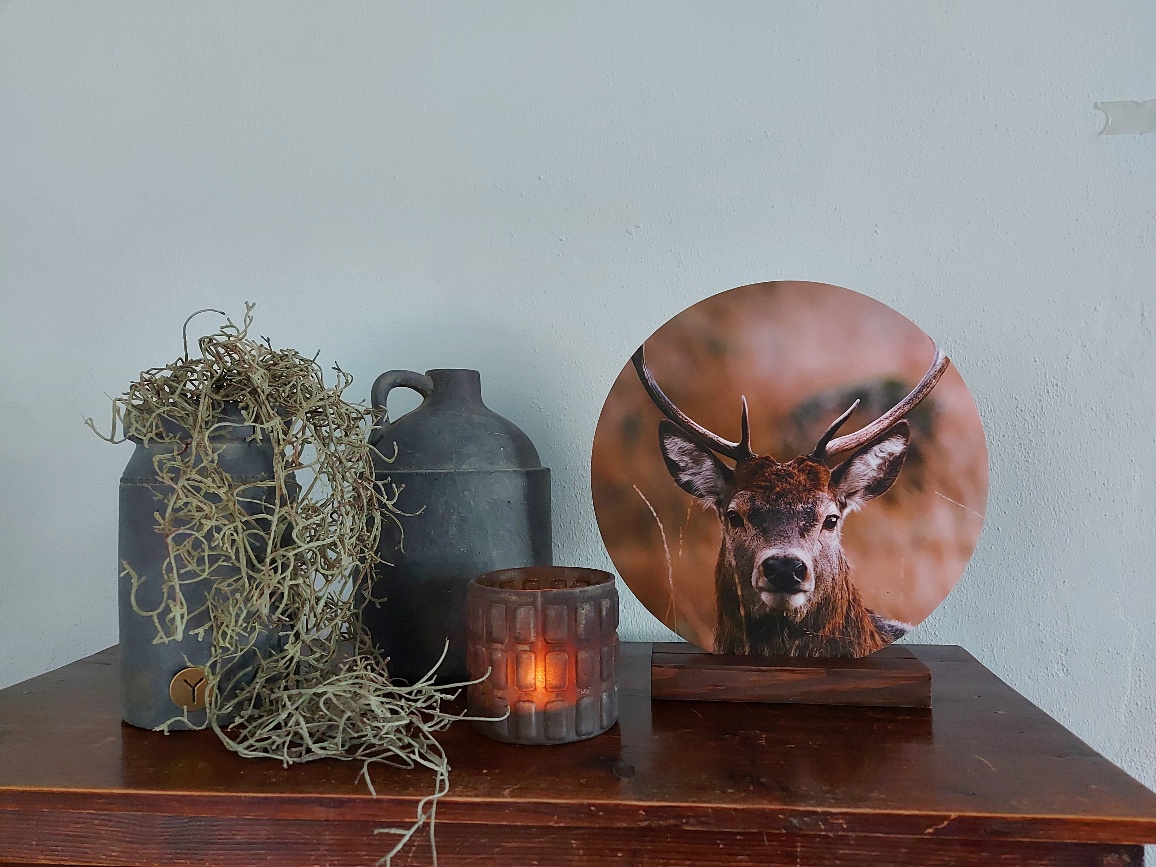 Fier en statig kijk dit hert je aan op deze muurcirkel. Verscholen tussen het hoge gras kruist zijn blik de lens van de fotograaf. Een prachtige ontmoeting in de natuur tussen mens en dier. Een wanddecoratie met dit prachtige hert brengt heel eenvoudig sfeer in je huis. Mooi aan uw wand en landelijk in uitstraling!